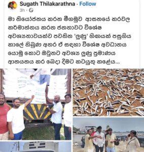 මීගමුව ආසනයේ කරවල කර්මාන්තයේ යෙදෙන ජනතාවට ලුනු ආනයනය කර ලබාදීමට කටයුතු කළ බව ක්රීඩා නියෝජ්ය අමාත්ය සුගත් තිලකරත්න පවසයි.