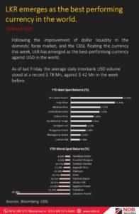 ඇමරිකානු ඩොලරයට සාපේක්ෂව පසුගිය සතියේ ලොව වඩාත් ශක්තිමත් වූ මුදල් ඒකකය බවට ශ්‍රී ලංකා රුපියල පත්ව තිබේ.